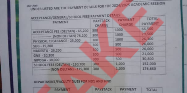 The attention of the Management of Delta State Polytechnic, Ogwashi-Uku has been drawn to the undated fake publication on the payment details for the 2024/2025 academic session as published by an unknown fraudster who wants to tarnish the image and reputation of the Management.